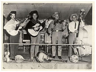 I regret to inform you that thus far there are no albums (that I've found) that document this influential old-school, hard-country band from Missoula, though apparently they self-released a few singles, back in the day. Up through 1954, the band's main quartet was made up of multi-instrumentalists Orval Fochtman, brothers Harold and Vern Wilburn, and Jimmy Widener, although a bunch of other local lads cycled through the group during its long career. The Snake River Outlaws were a legendary Montana band from the 1940s and '50s who starred in their own live revue, The Sunshine Jamboree, which was broadcast every Saturday on KXLL-AM, Missoula. Though an album remains to be made, some vintage video survives -- not much, because Mr. Fochtman used to save money by recording over their weekly airchecks, and after years and years of playing live, only a handful of tapes were left. (The sound quality on the ones I've heard, though, is quite good, so maybe some of you collector-label reissue folks could get on the stick and press me up a vinyl copy or two?) At any rate, the Outlaws left a long legacy, with alumni such as guitar picker Larry Caldwell, et.al., fanning out to other states as they pursued their careers, while Harold Wilburn's son, T. Scot Wilburn, played in the neo-cowhand Americana band, Wylie & The Wild West and later formed his own group, The Shut Up And Play Boys. Orval Fochtman also performed in some old-timey music competitions and appears on at least one early 'Sixties festival album. I'm serious, though: can somebody put out an album already?