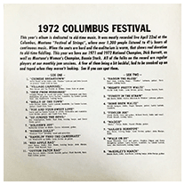 Mostly fiddle tunes and other old-timey music, with a little bit of country, like a Merle Haggard tune or two... Most of the participants were Montana residents, with the notable exception of Dick Barrett, a champion fiddler from Texas who had won the National Fiddle Championship in Weiser, Idaho in 1971 and '72. [Note: As you'll see below, these Columbia festival albums get a bit confusing... The series continued for years but they never settled on a consistent way to name them. I've chosen to list them strictly as they are labeled, though even then you'd get records that had one name on the outer cover and something different written inside. Part of the homespun charm, I guess.]